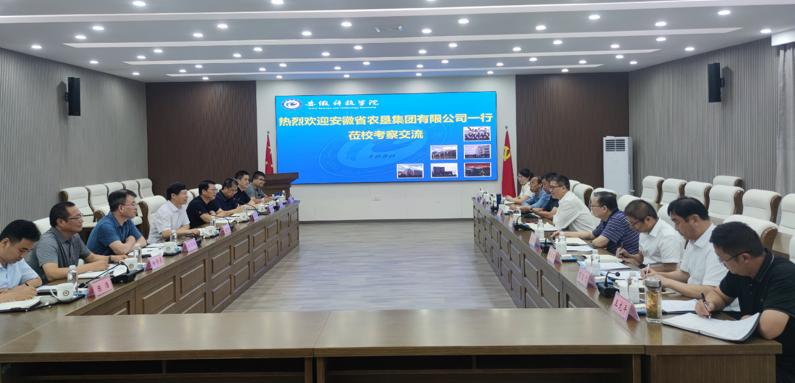8月13日,省农垦集团党委书记、董事长张其广率队赴安徽科技学院洽谈合作。安徽科技学院党委书记时伟,党委副书记、校长李升和,党委委员、副校长赵伟峰,农垦集团党委委员、总经理助理陈军参加。