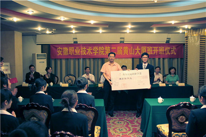 5月18日下午,安徽职业技术学院第二届黄山大厦班开班仪式在黄山大厦城市酒店隆重召开。安徽职业技术学院院长陈传海率管理系领导,省农垦集团副总经理、黄山大厦酒店投资发展有限公司总经理陈仁虎及黄山大厦酒店管理公司相关负责人出席仪式。陈仁虎和陈传海先后作讲话并为开班仪式揭牌。黄山大厦酒店管理公司董事长王健颁发了第一笔助学金。
