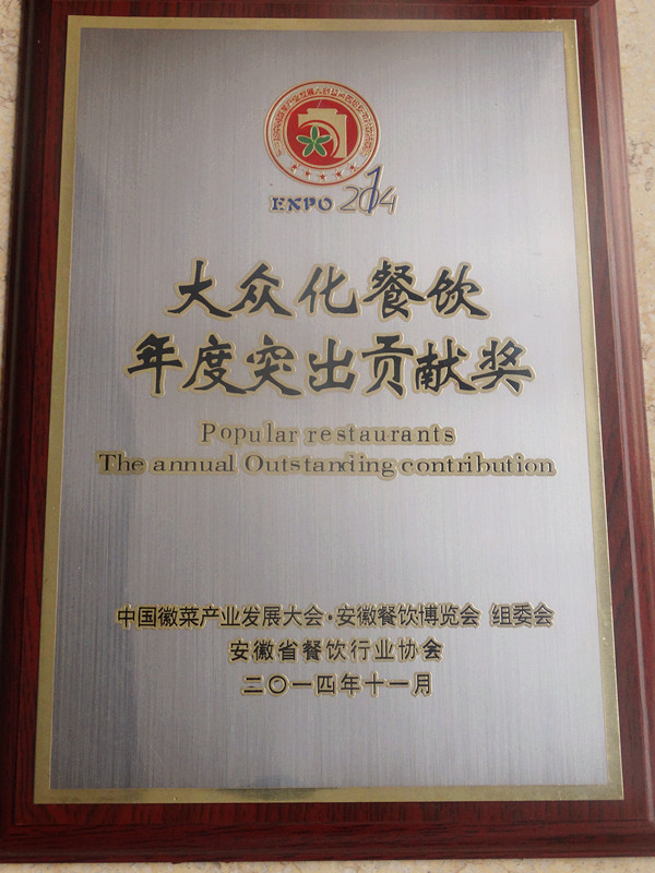 第三届中国徽菜产业发展大会暨第四届安徽餐饮博览会于近日召开,大会主题是产业化、大众化、品牌化、信息化 来自北京、上海、江苏、浙江、安徽等省市近600名企业家参会。黄山大厦KK快餐公司总经理王敏在会上荣膺大众化餐饮2014年度突出贡献奖