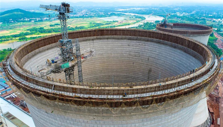 据了解,该工程1号冷却塔使用混凝土总方量近1.2万方,当前正抓紧进行预制构件加工、吊装及筒壁内侧防腐工作,2号冷却塔筒壁已施工至100节。