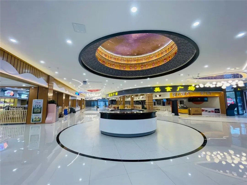来到商业综合体,便能浓烈感受到一波现代与复古杂糅的商业场景。首先是能清晰地看见商场内部轮廓。低头间,灰白相间的地砖、挥洒自如的曲线、优雅流畅的弧度,都无不营造着现代艺术上的视觉冲击。抬头望,那璀璨星空映照下的朱门黛瓦,更是在这新与旧的碰撞中尽显质感,令人流连忘返。