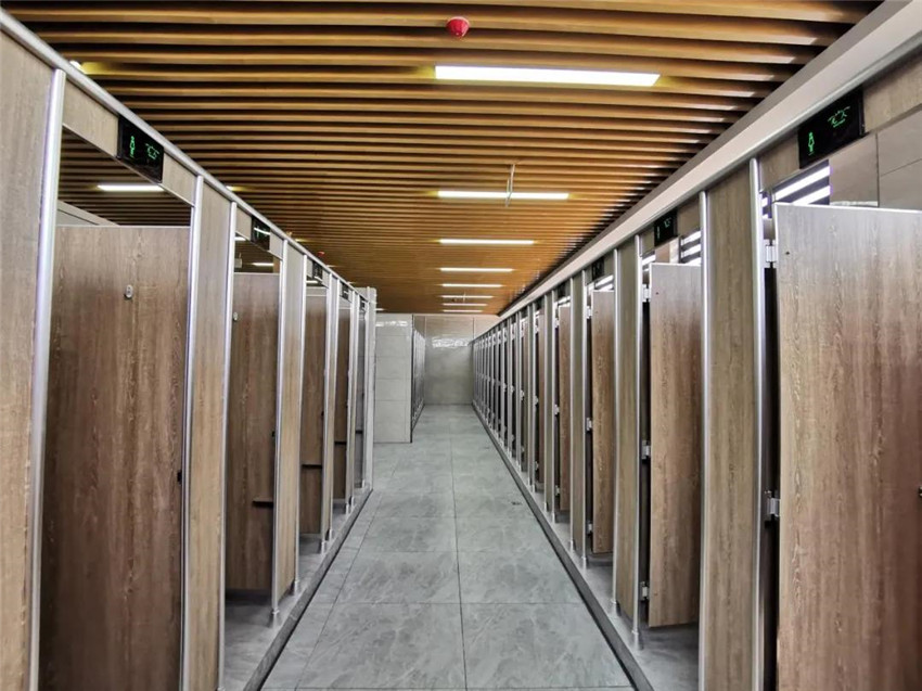 走进卫生间,顶部大面积的金属隔栏与纯色平板吊顶虚实呼应,以浅棕色为主色调的木纹隔板与淡黄色的瓷砖墙面显得清新明快。洗手台采用高地盆设计,能同时满足不同人群的需求。每个洗手池上方都配备了智慧镜面,与隔间的智能感应电子屏,无不充满着智慧的元素。同时,卫生间还引进新风空气净化系统,时刻维持着干净、怡人的良好环境。