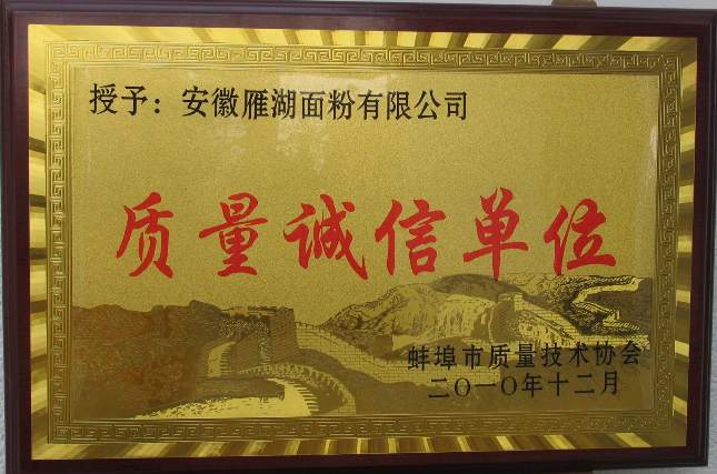 近日,皖垦食品集团雁湖面粉公司被评为市级“质量诚信单位”,受到了蚌埠市的表彰。(陈敏)